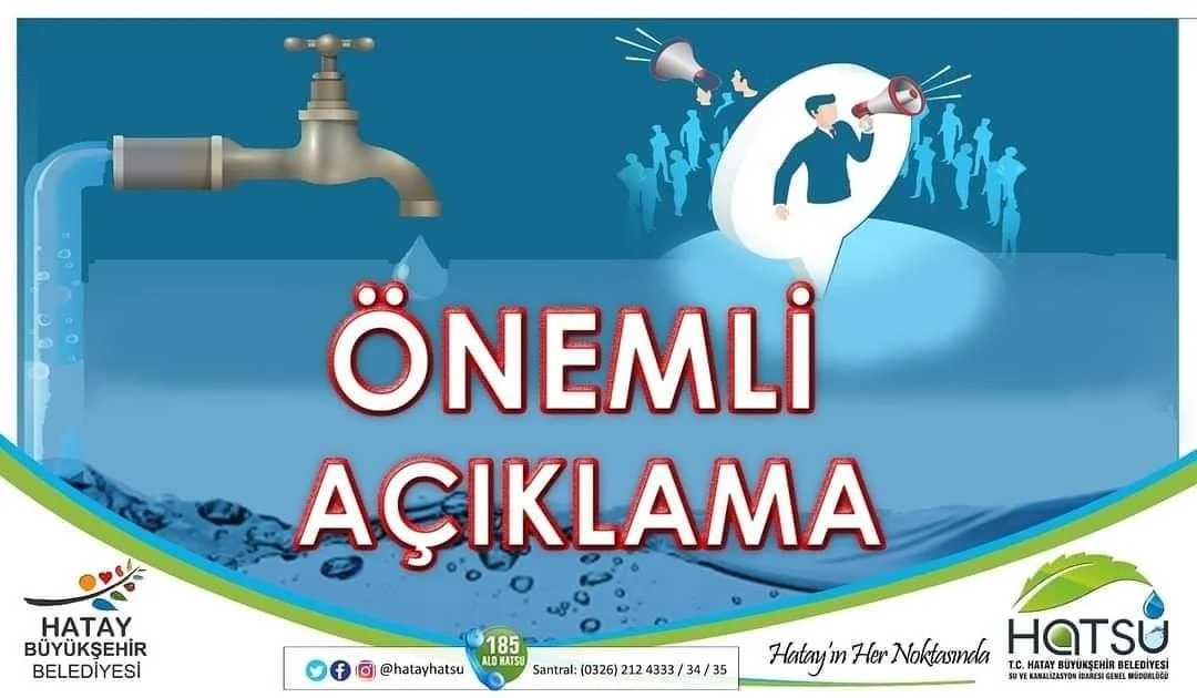 Hatsu’dan Yapılan açıklamaya göre ; İskenderun ilçesine bağlı Kurşunlu Mahallesi‘nde yaşanan heyelandan dolayı Denizciler, Sarıseki, Karayılan, Azganlık, Akarca, Kavaklıoluksu Mahallelerinde su kesintisi yaşanmaktadır.