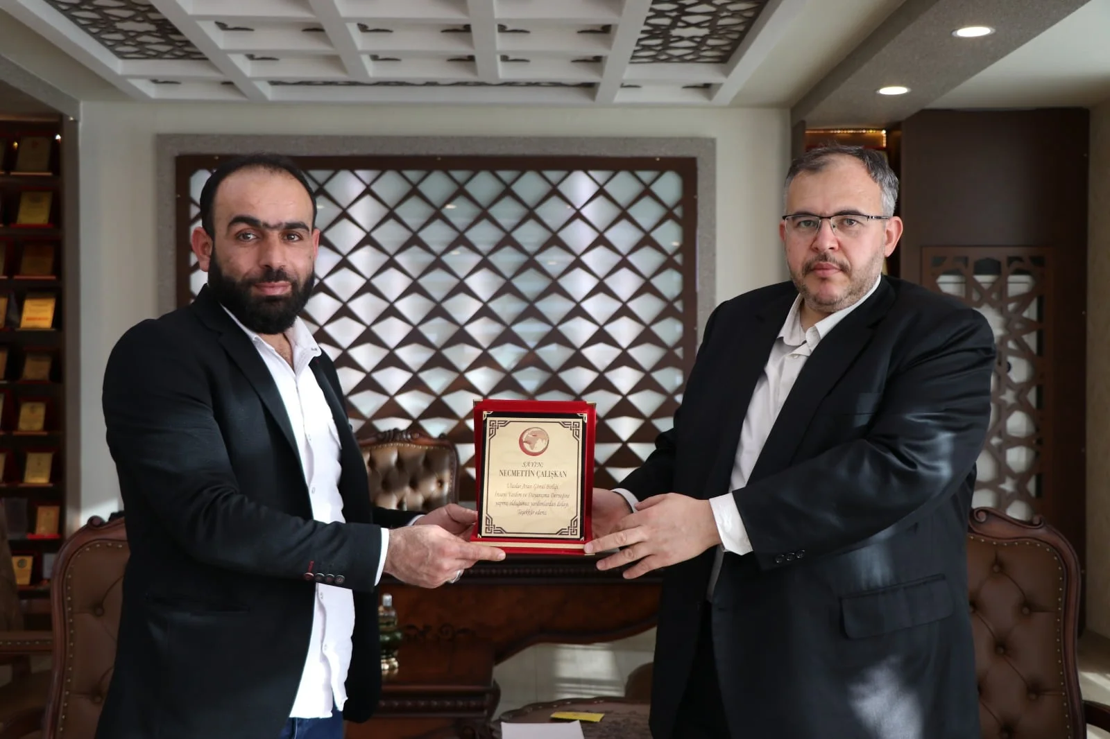 Uluslararası Gönül Birliği İnsani Yardım ve Dayanışma Derneği Başkanı Halit Şiraki ve Başkan Danışmanı Fatma Zehra Değirmenci hayırsever İş İnsanı Doç. Dr. Dr. Necmettin Çalışkan’ı ziyaret ederek plaket takdim etti.