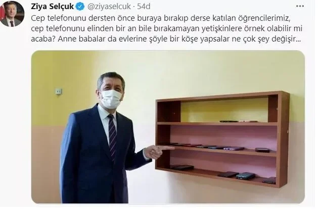 Selçuk, bir okulda öğrencilerin dersten önce cep telefonlarını bıraktıkları rafı işaret ettiği fotoğrafını Twitter hesabından paylaşarak, “Cep telefonunu dersten önce buraya bırakıp derse katılan öğrencilerimiz, cep telefonunu elinden bir an bile bırakamayan yetişkinlere örnek olabilir mi acaba?” ifadesini kullandı.