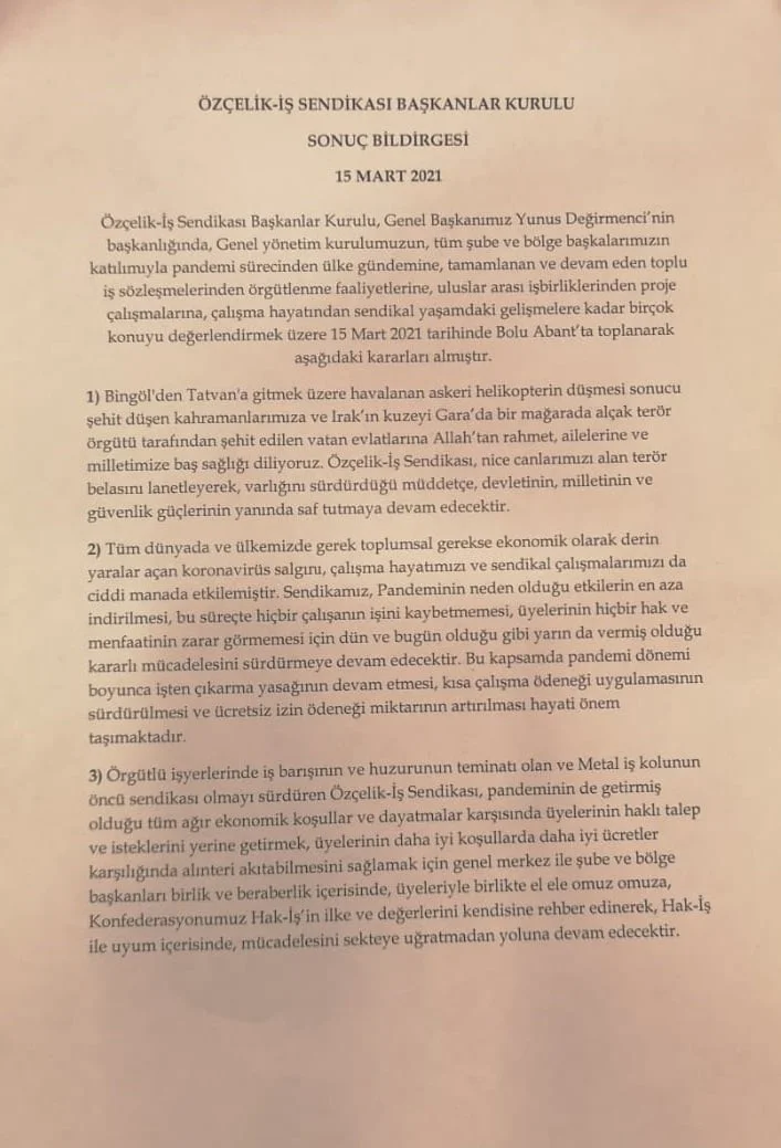 Özçelik-İş Sendikası Başkanlar Kurulu, Bolu Abant’ta Büyük Abant Otel’de Genel Başkan Yunus Değirmenci’nin başkanlığında, Genel Başkan Yardımcıları Bayram Altun, Recep Akyel, Ferhan Öner, Genel Sekreter Hicret Bozoklu ile tüm şube ve bölge başkanlarının katılımıyla yapıldı.