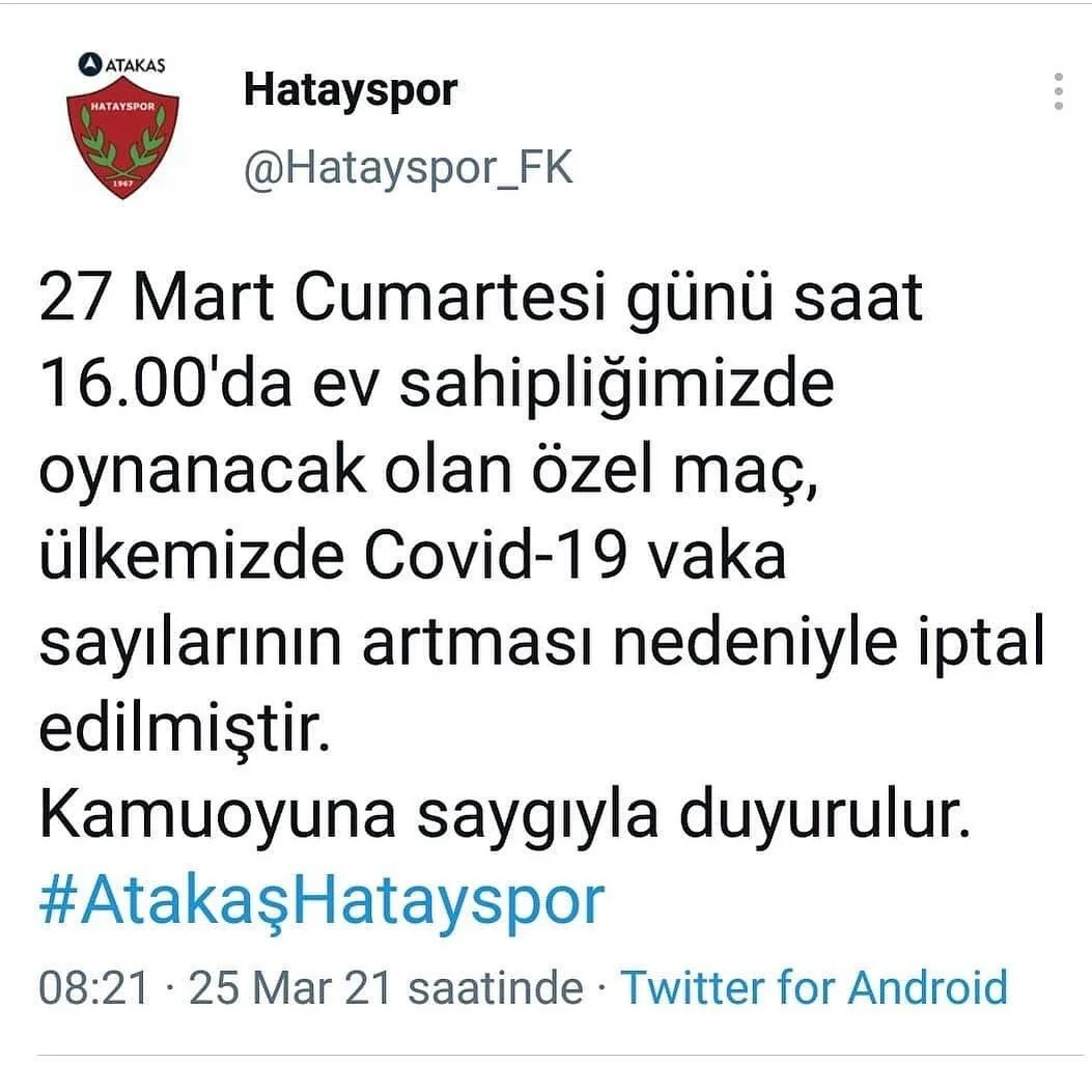 Atakaş Hatayspor, yeni stadyumun açılışında 27 Mart günü oynayacağı Fenerbahçe ile yapacağı özel maç, Kovid-19 salgını artışı nedeniyle iptal oldu.