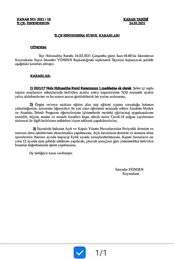 İskenderun “İlçe Umumi Hıfzısıhha Kurulu” Kaymakam İskender Yönden’ in başkanlığında 24 Mart 2021 günü toplanmış olup, toplantı neticesinde alınan 2021/18 nolu kurul kararları ilanen tebliğ olunmaktadır.