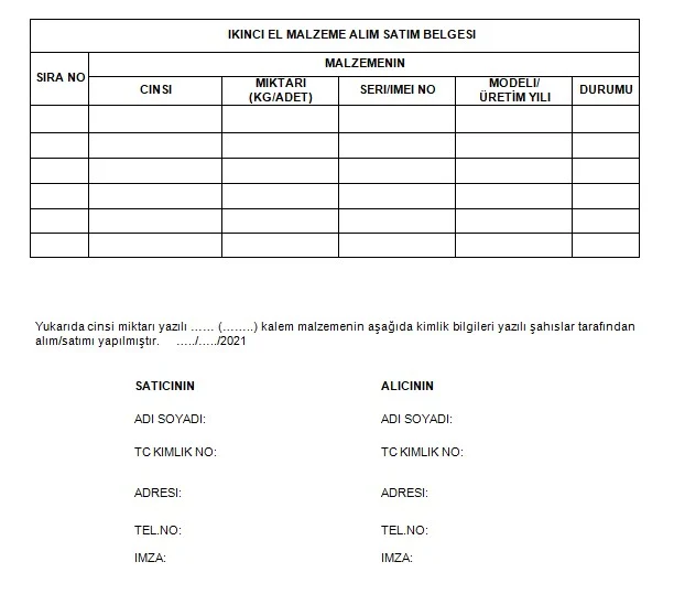 – Elektronik eşya ve beyaz eşya olarak tabir edilen (Cep telefonu, bilgisayar, tablet, fotoğraf makinası, televizyon, buzdolabı, çamaşır makinesi, bulaşık makinesi, akü, bakır malzeme vb.) eşyaları ikinci el olarak alım ve satım üzerine faaliyet gösteren işyerlerinde eşyayı satan ve satın alan kişi/kişilere ait kimlik ve adres bilgileri ile alışveriş işlemini gerçekleştirdiği tarih bilgilerinin, eşya miktar ve özelliklerini belirtir Ek’teki İkinci El Malzeme Alım Satım Belgesi’nin tanzim edilmesi veya eşya ile ilgili fatura alınması, kolluk kuvvetleri tarafından istenilmesi durumunda formun veya faturanın ibraz edilmesi,