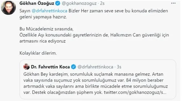 Bakan Koca da Özoğuz’un mesajını alıntılıyarak, “Gökhan Bey, tekrar merhaba. Hep birlikte elimizden geleni yapmaya çalıştıkça zorluklar kolaylaşacak. Aşı konusunda gerçek, algılanandan kat kat iyi, daha da iyi olacak. Mesajınız için teşekkürler.” ifadelerini kullandı.