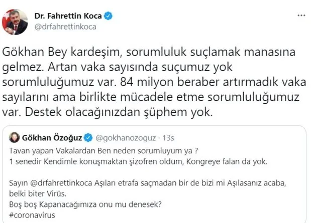Koca,“Gökhan Bey kardeşim, sorumluluk suçlamak manasına gelmez. Artan vaka sayısında suçumuz yok sorumluluğumuz var. 84 milyon beraber artırmadık vaka sayılarını ama birlikte mücadele etme sorumluluğumuz var. Destek olacağınızdan şüphem yok.” dedi.