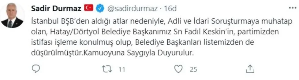 “İstanbul BŞB’den aldığı atlar nedeniyle, Adli ve İdari Soruşturmaya muhatap olan, Hatay/Dörtyol Belediye Başkanımız Sn Fadıl Keskin’in, partimizden istifası işleme konulmuş olup, Belediye Başkanları listemizden de düşürülmüştür.