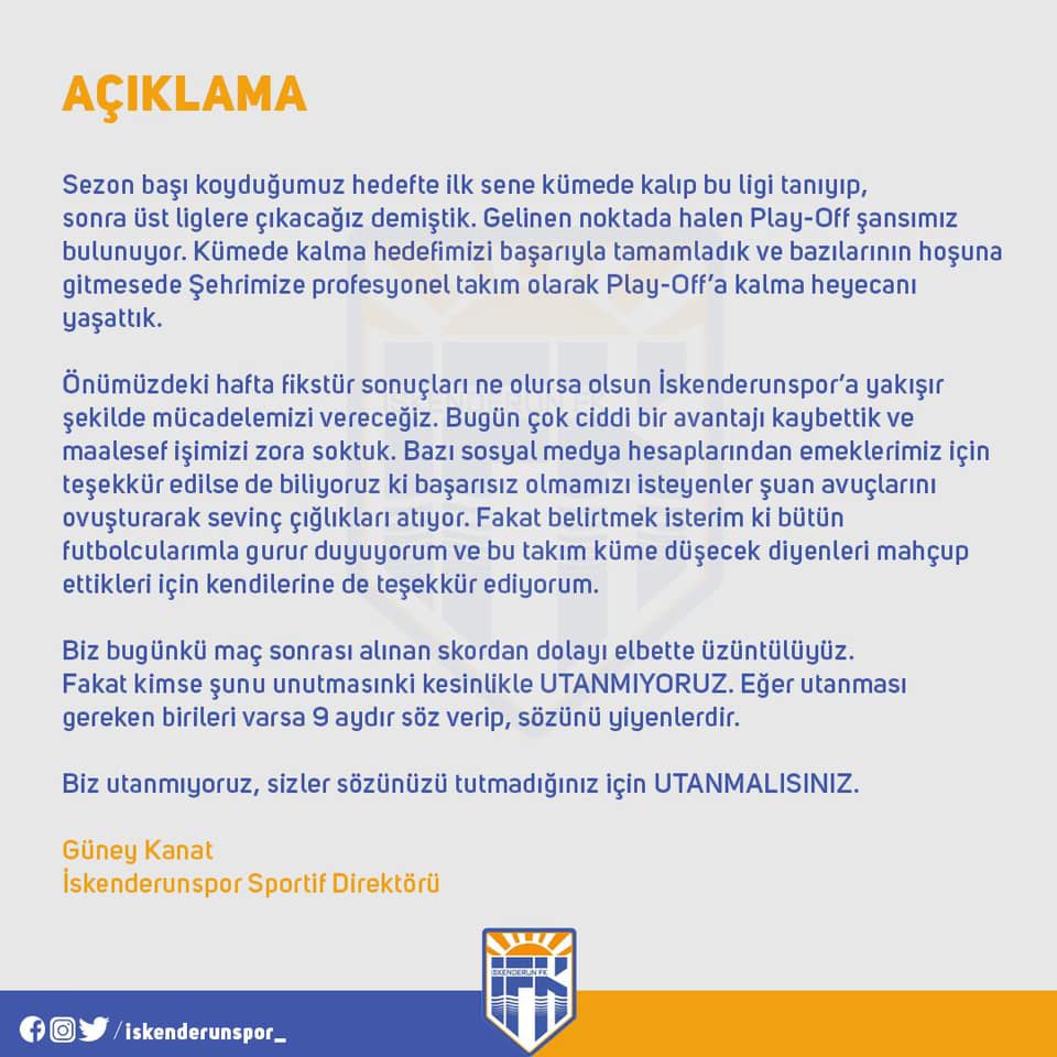 İskenderunspor Sportif Direktörü Güney Kanat Takıma Söz verip yardımda bulunmayanlara Sert Açıklama yayınladı..