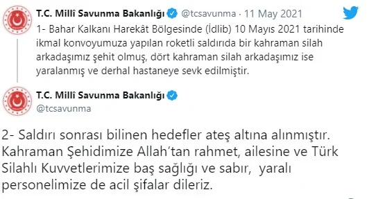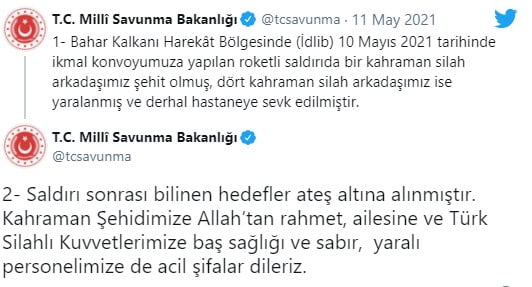 “Bahar Kalkanı Harekât bölgesinde (İdlib) 10 Mayıs 2021 tarihinde ikmal konvoyumuza yapılan roketli saldırıda bir kahraman silah arkadaşımız şehit olmuş, dört kahraman silah arkadaşımız ise yaralanmış ve derhal hastaneye sevk edilmiştir.”