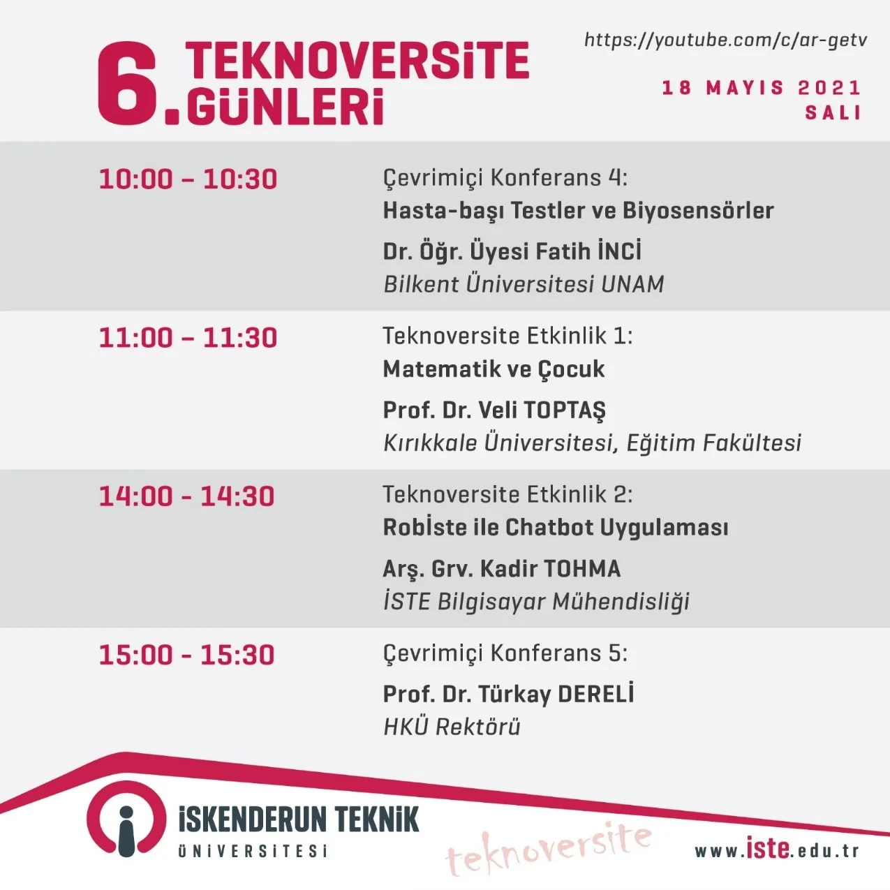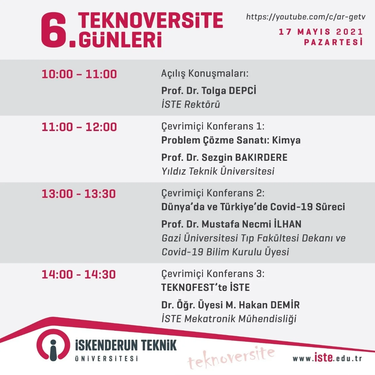 17 Mayıs Pazartesi günü İSTE Rektörü Prof. Dr. Tolga Depci’nin açılış konuşmasıyla başlayacak olan çevrimiçi etkinliklerin ilk gününde üç çevrimiçi konferans gerçekleştirilecek. Bu konferanslarda saat 11.00’da Yıldız Teknik Üniversitesi öğretim üyesi Prof. Dr. Sezgin Bakırdere Problem Çözme Sanatı: Kimya, saat 13.00’da Gazi Üniversitesi Tıp Fakültesi Dekanı ve Covid-19 Bilim Kurulu Üyesi Prof. Dr. Mustafa Necmi İlhan Dünya’da ve Türkiye’de Covid-19 Süreci ve saat 14.00’da İSTE Mekatronik Mühendisliği öğretim üyesi Dr. Öğr. Üyesi M. Hakan Demir TEKNOFEST’te İSTE konularını ele alacak.