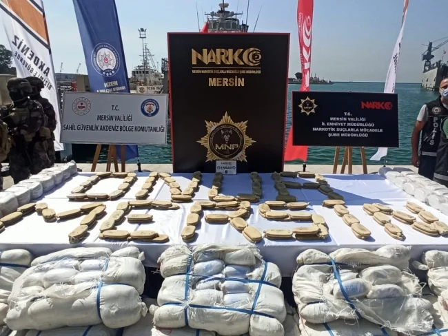 Ele geçirilen 1,5 tonun üzerinde uyuşturucu madde, Mersin’deki Sahil Güvenlik Akdeniz Bölge Komutanlığı’na götürüldü.