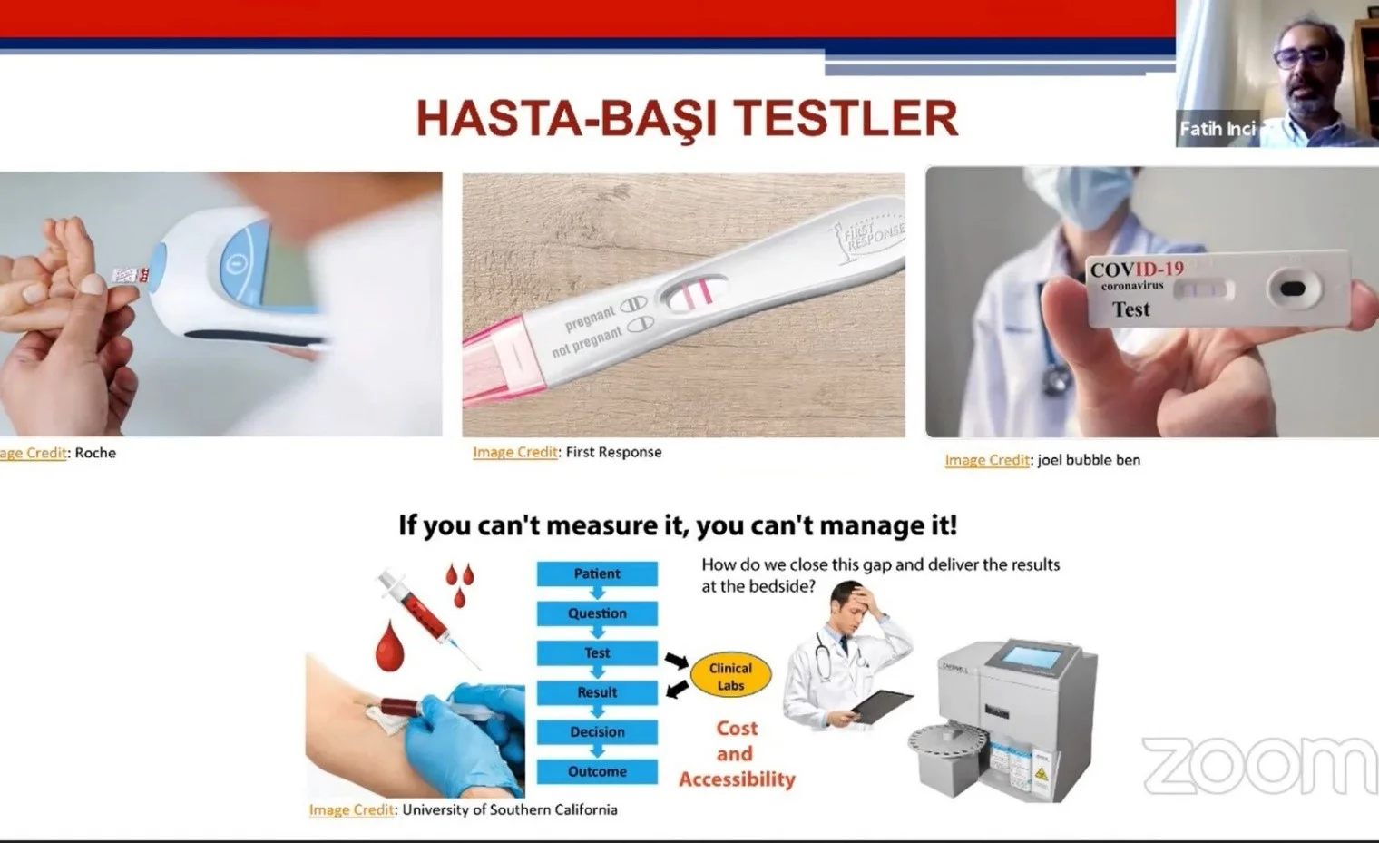 Sunumunda öncelikle yapmış olduğu ulusal ve uluslararası çalışmalardan söz eden İnci, ardından hasta başı testlerin neler olduğuna ve biyosensörlerin kullanımına değindi. Kullanımda olan hasta başı testlerin kullanım biçimlerini ve testlerin ne gibi faydalar sağladığını irdeleyen Dr. Öğr. Üyesi Fatih İnci Dünya Sağlık Örgütü’nün bu testlerin kullanımı için gerekli gördüğü kriterler hakkında bilgi verdi. Biyosensör alanında yapılan çalışmaların sağlık hizmetlerinin gelişimine sunacağını katkıları ele alan İnci, çalışmaların yakın geleceği ile ilgili öngörüleri katılımcılar ile paylaştı.
