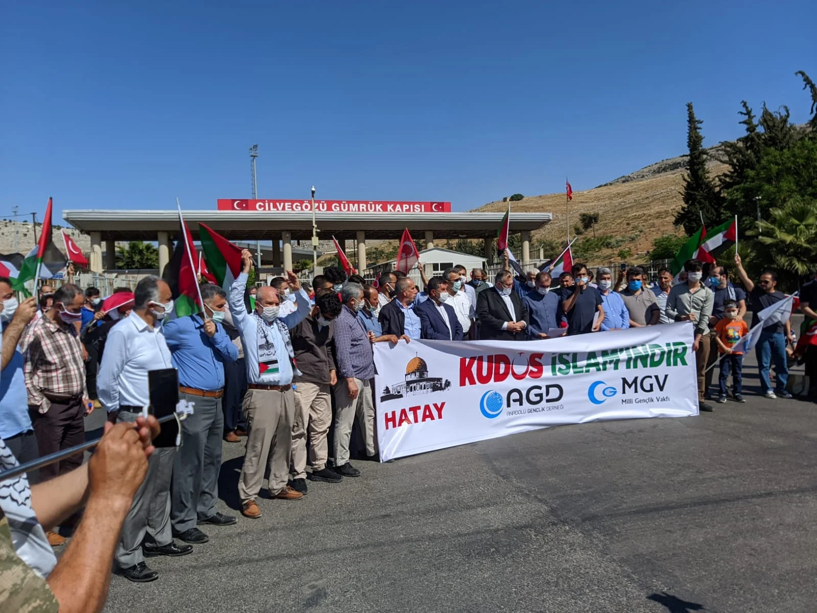 Cilvegözü Sınır Kapısı önünde bir araya gelen vatandaşlar “Kudüs İslam’ındır” pankartı açarak İsrail aleyhine sloganlar attı.