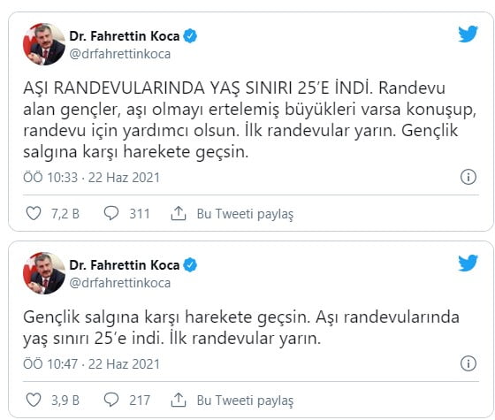 “Aşı randevularında yaş sınırı 25’e indi. Randevu alan gençler, aşı olmayı ertelemiş büyükleri varsa konuşup, randevu için yardımcı olsun. İlk randevular yarın. Gençlik salgına karşı harekete geçsin.”