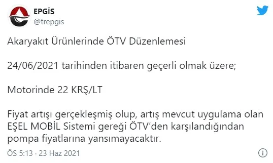 EPGİS’den yapılan açıklamada “Akaryakıt Ürünlerinde ÖTV Düzenlemesi 24/06/2021 tarihinden itibaren geçerli olmak üzere; Motorinde 22 KRŞ/LT Fiyat artışı gerçekleşmiş olup, artış mevcut uygulama olan EŞEL MOBİL Sistemi gereği ÖTV’den karşılandığından pompa fiyatlarına yansımayacaktır.” denildi.