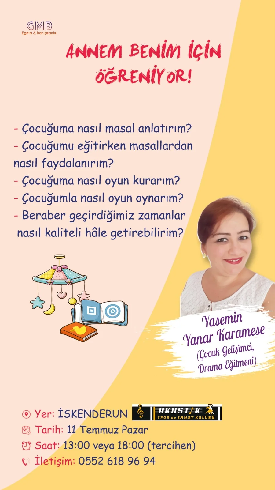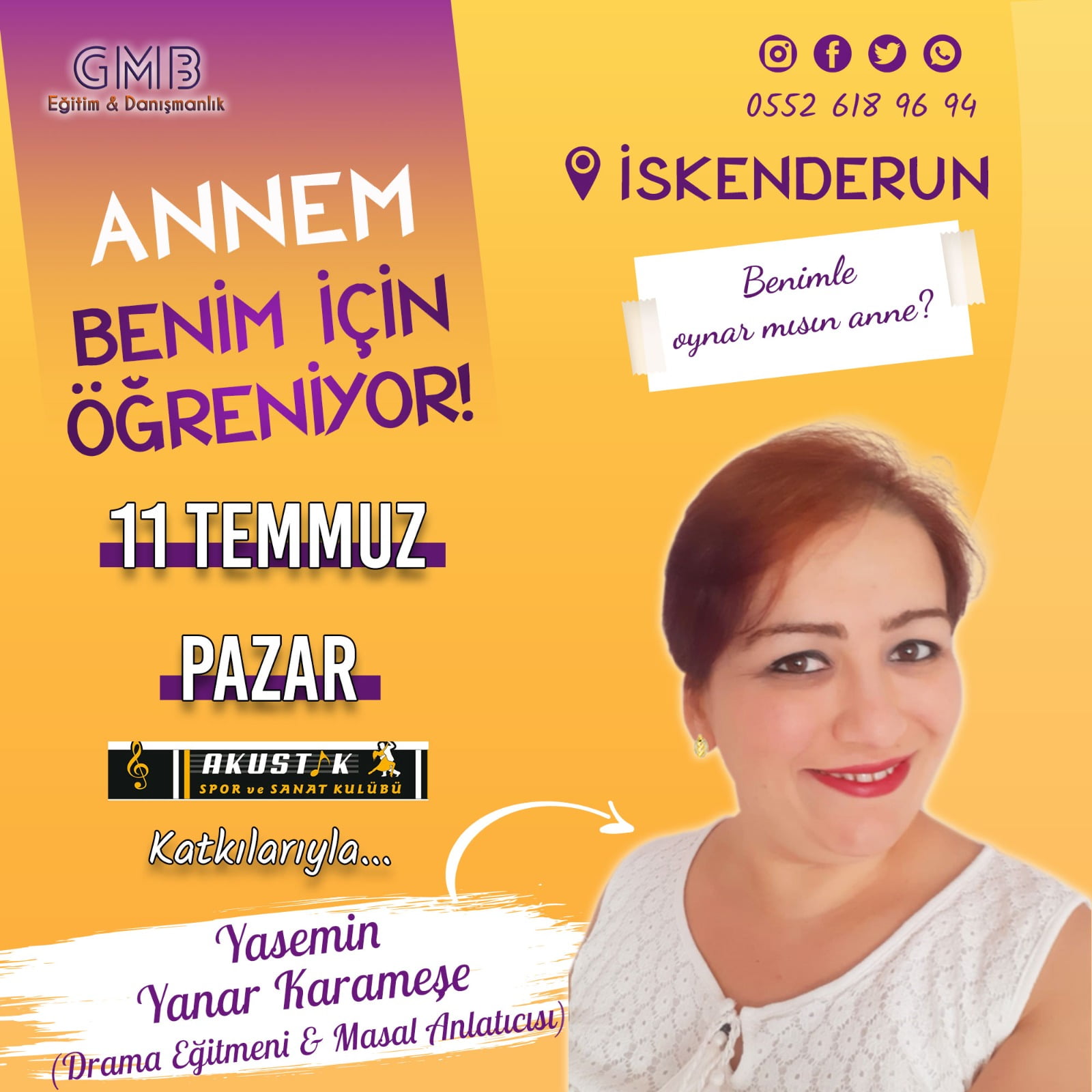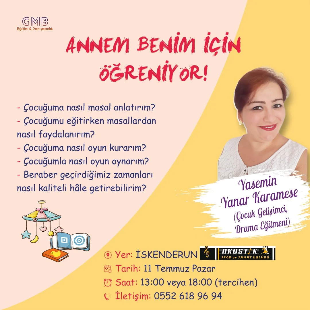 Drama Eğitmeni ve Masal Anlatıcısı Yasemin Yanar Karameşe tarafından verilecek olan ”Annem Benim İçin Öğreniyor” eğitimi İskenderun’da GMB Eğitim ve Danışmanlık tarafından gerçekleştirilecek.