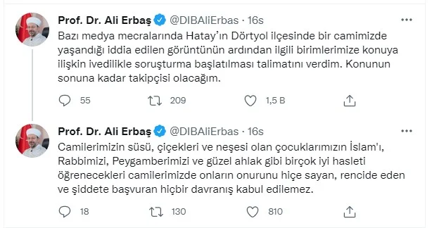 Prof. Dr. Ali Erbaş ; Bazı medya mecralarında Hatay’ın Dörtyol ilçesinde bir camimizde yaşandığı iddia edilen görüntünün ardından ilgili birimlerimize konuya ilişkin ivedilikle soruşturma başlatılması talimatını verdim. Konunun sonuna kadar takipçisi olacağım.