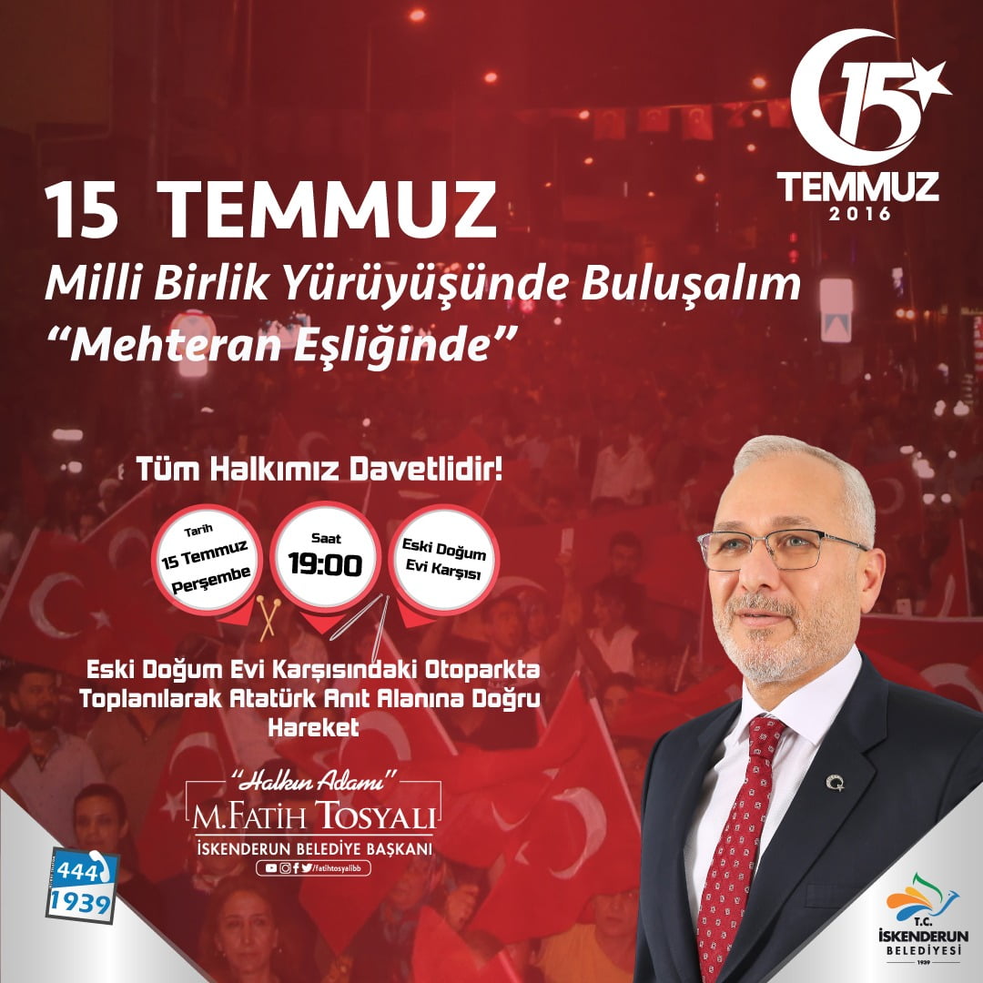 İskenderun Belediye Başkanı Fatih Tosyalı, 15 Temmuz Demokrasi ve Milli Birlik Günü etkinliklerine bütün İskenderunluları davet etti.