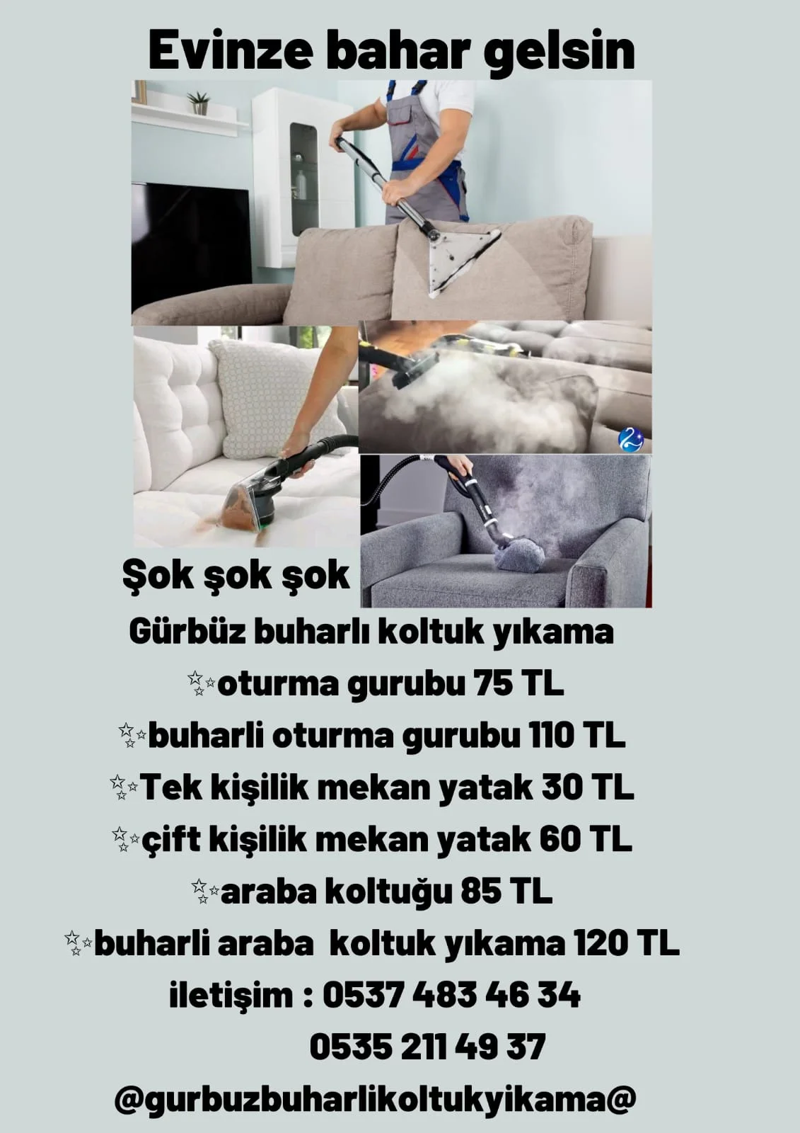 Gürbüz buharlı koltuk yıkama firması , koltuk yıkama hizmetiyle evinizde veya iş yerinizdeki koltukları hijyenik koşullarla eşyalarınıza zarar vermeden son teknoloji makinalarla özenle yıkamaktadır.