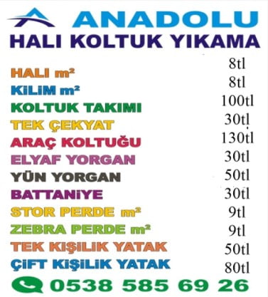 Anadolu Koltuk Halı Yıkama firması , Halı yıkama, yerinde halı yıkama, koltuk yıkama hizmetiyle evinizde veya iş yerinizdeki koltukları hijyenik koşullarla eşyalarınıza zarar vermeden son teknoloji makinalarla özenle yıkamaktadır.