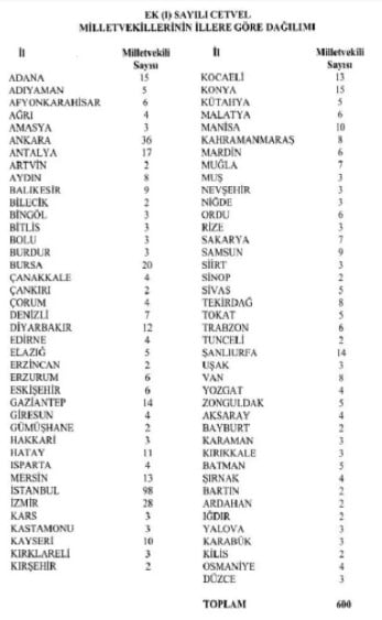 Türkiye Büyük Millet Meclisi’nde (TBMM) görev yapacak 600 milletvekilinin illere göre dağılımı netleşirken, kararda, seçimde hangi ilden kaç milletvekili çıkarılacağı ve illerin kaç seçim bölgesinden oluşacağı aktarıldı.