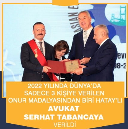 Dünya çapında stratejik ve sosyal çalışmalar yürüten kuruluşların ortak değerlendirmesi sonucunda Uluslararası çalışmalarda gösterdiği başarılar nedeni ile bu yıl Dünya’da sadece 3 kişiye verilen Onur Madalyasından biri Karadağ Cumhurbaşkanı Milo Dukanovic ve Türk Devletleri Teşkilatı Başkanı, 27. Başbakanı Binali Yıldırım tarafından Hatay’lı Avukat Serhat Tabanca’ya takdim edildi. Kendisi ile birlikte madalyaya layık görülen Moldova Cumhurbaşkanı Petru Lucınshı ve Belçika Parlamentosu Milletvekili, eski Bakan Emir Kır’ı tebrik eden Avukat Serhat Tabanca böylesine değerli bir ödüle layık görüldüğü için çok mutlu olduğunu belirterek Onur Madalyasına kendisini layık gören kuruluşlara ve Karadağ Cumhurbaşkanı Milo Dukanovic’e ve Türk Devletleri Teşkilatı Başkanı, 27. Başbakanı Binali Yıldırım’a teşekkür etti.