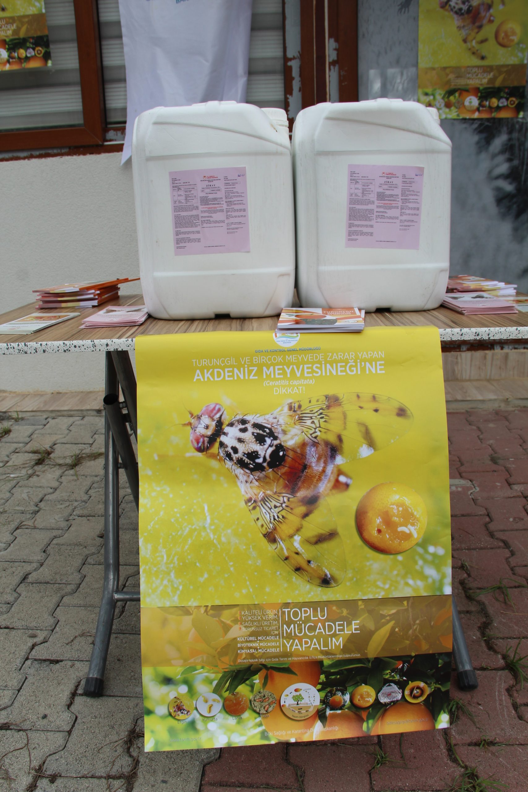 Akdeniz Meyve Sineği Tuzağı hakkında da bilgiler veren İl Müdürü Çolakoğlu; “Akdeniz Meyve Sineği ile biyoteknik mücadelenin bir parçası olan tuzak metodu, feromonlar kullanılarak uygulanmaktadır. İçinde karşı cinsin kokusunu bulunduran tuzaklar, böcekleri cezbederek imha etmektedir. Böylelikle erginler yok edilerek böceklerin üremesi engellenmektedir. Tuzaklar bir dönüme 5 adet tuzak asılarak yerleştirilir. Meyvelerde kalıntı bırakmayan bu yöntemde, tuzakların kapağında disk şeklinde aktif madde emdirilmiş bölge bulunmakta ve tuzak asıldıktan toplanana kadar etkisini koruyan feromonlar, 120 güne kadar etkili olmaktadır. Yerden yaklaşık 1.5 metre yükseğe asılan Akdeniz Meyve Sineği tuzakları, ağacın güney yüzüne yerleştirilir. Öğlen güneşine doğru bahçeye homojen bir şekilde yerleştirilen mücadele araçlarının girişlerinin dallar ve yapraklar nedeniyle tıkanmadığından emin olmak gerekir. Çiftçilerimizin tuzakları kurarken, kaldırırken eldiven takması gerekir. Tuzakların meyve renk değişiminden ortalama 2 hafta önce asılması tuzakların etkinliğini artırır. Birçok Akdeniz ülkesinde kullanılan Akdeniz Meyve Sineği tuzakları, kullanımı kolay, ekonomik ve depolaması zahmetsizdir.” dedi.