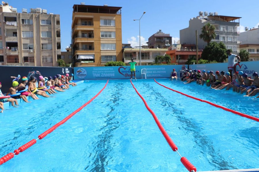 ‘Yüzme Bilmeyen Kalmasın’ projesiyle öğrencilerin yaz mevsiminde yüzmeye yoğun ilgi göstermesiyle İskenderun Gençlik ve Spor İlçe Müdürlüğü Kapalı Spor Salonu ve Denizciler Mahallesi olmak üzere 1.20 metre derinliğinde ve 6×12 ebadında 2 adet portatif yüzme havuzu kurularak faaliyetlerine başladı.